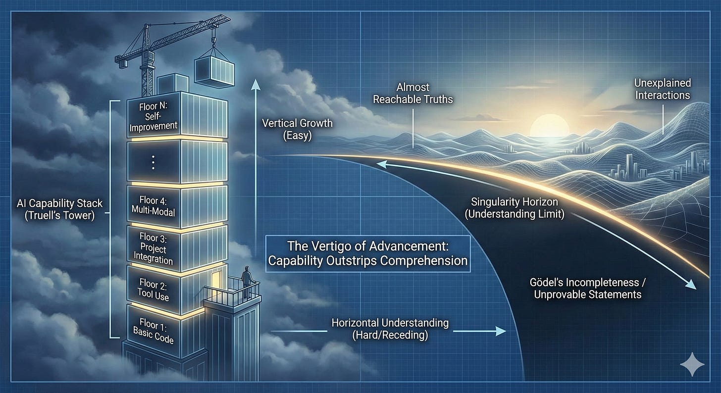 Gödel’s incompleteness results give that sliding a hard edge. Once a system of rules is strong enough to express ordinary arithmetic and stays consistent, it inevitably contains true statements it cannot prove from within those rules. If you upgrade the system to capture more truths, you don’t eliminate those unprovable statements; you push the boundary outward and create new ones at the new level. There is always a band of “almost reachable” truths that recede as you advance. When you combine that with the singularity picture and Truell’s tower, you get a particular kind of vertigo: each floor you add with AI expands not only what your system can do, but also the slice of its behavior you cannot fully analyze or guarantee from inside your current practices.